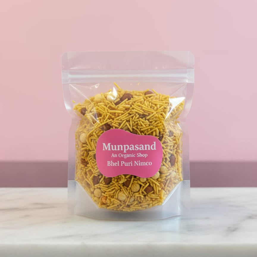 Bring street food magic to your home with Munpasand Bhelpuri Nimco – a zesty, crunchy mix inspired by the classic Indian bhelpuri. Made with puffed rice, crispy sev, fried lentils, peanuts, and a special blend of tangy spices, this savory snack delivers a bold burst of flavor in every bite.
